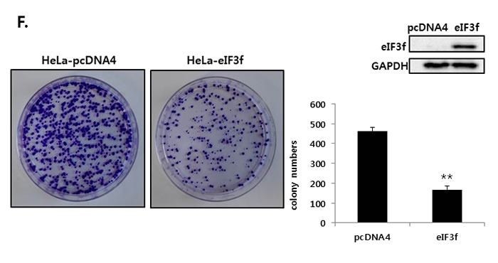 We further compared the ability of these cell lines to form colonies. Consistent with the cell growth data, eIF3f-transfected HeLa cells formed significantly fewer colonies than did vector-transfected cells. The expression of eIF3f was confirmed by Western blotting (Figure 3F). Therefore, eIF3f reduced cancer cell proliferation significantly.