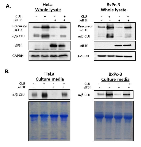 Figure 5: sCLU expression and secretion in whole cell lysates and culture media. HeLa and BxPc-3 cells were transfected with CLU or eIF3f expression vectors. Forty-eight hours after transfection, whole cell lysates A. and culture media B. were harvested. The expression and secretion of sCLU were detected using Western blotting. GAPDH blots and Coomassie staining confirmed equal protein loading.
