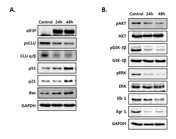 Protein extracts were prepared as described above, then separated by SDS-PAGE using 8 to 15% polyacrylamide gel and transferred onto a nitrocellulose membrane (Bio-Rad, 0.45µM). The membranes were blocked for 1hr in 5% skim milk and incubated at 4oC for overnight with specific primary antibody. Antibodies against CLU (sc-6419), p53(sc-6243), p21 (sc-397), Bax (sc-493), pERK (sc-7383), Elk-1 (sc-355), Egr-1 (sc-189), GSK-3β (sc-8257) and GAPDH (sc-25778) were purchased from Santa Cruz Biotechnology. Antibodies against p-Akt (#4060), pGSK-3β (#9331) and cleaved PARP (#9541) were purchased from Cell signaling. Antibodies against eIF3f (638202), Akt (1085-1) and flag (F1804) were purchased from Biolegend, EPIT-MICS and Sigma aldrich, respectively. Following primary antibody incubation, the membranes were washed three times for 5min in 1X TBS-T, incubated for 1hr with horseradish peroxidase-conjugated secondary antibody. Immunoreactivity was detected using ECL chemiluminescent solution (advansta) and exposed by Chemidoc (Bio-Rad).
