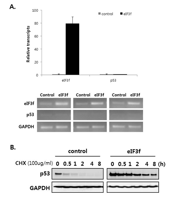 A previous result revealed that eIF3f increases p53 protein levels (Figure 6A). Therefore, we assessed how eIF3f inhibits p53 expression using qRT-PCR and cycloheximide (CHX) assays. We first measured whether eIF3f affects p53 levels. qRT-PCR revealed that eIF3f did not stimulate the upregulation of p53 mRNA (Figure 7A), suggesting that eIF3f does not inhibit p53 levels. Therefore, we hypothesized that eIF3f might stabilizes p53, because sCLU inhibits the p53 stability [31]. Therefore, HeLa cells were treated with cycloheximide to inhibit protein translation, and then the p53 degradation rate was compared between eIF3f- and control-transfected cells. As shown in Figure 7B, eIF3f increased and stabilized the levels of endogenous p53. These results suggest that eIF3f promotes the tumor suppressor function of p53 by increasing the stability of p53 protein.