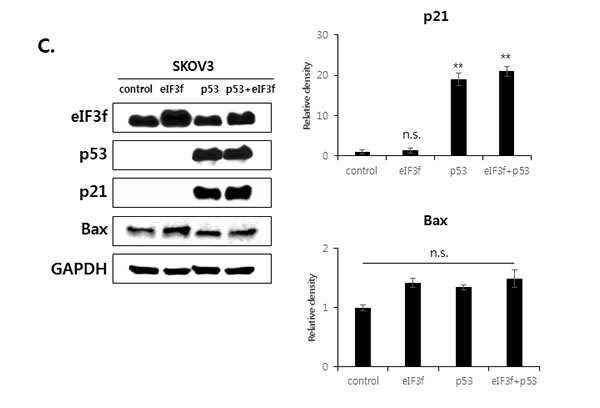 We next defined the relationship among p53, p21, and Bax during eIF3f-induced apoptosis. SKOV3 p53−/− cells were transfected with eIF3f or p53. Transfection with eIF3f resulted in the accumulation of p21 in p53-transfected cells, whereas Bax was activated in both p53-transfected and un-transfected cells. In addition, Bax expression was increased to a greater extent in cells transfected with both p53 and eIF3f compared with p53 alone. Western blotting then revealed that the upregulation of p21 after eIF3f overexpression was p53-dependent, whereas Bax activation was both p53-dependent and -independent (Figure 7C).
