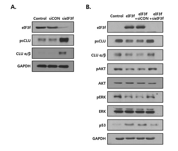 The previous figures show that eIF3f inhibited CLU expression and induced apoptotic signal. So, we examined whether this effect is especially mediated by inhibition of CLU. Knockdown of eIF3f in the HEK293a cells increased the CLU expression at 72h post transfection (Figure 8A). As shown in Figure 8B, CLU expression was diminished in eIF3f overexpressed HeLa cells, wheras it was restored to its original expression by transfection of eIF3f siRNA. Furthermore, expression of downstream factors of CLU was also returned to their intrinsic expression, together. These results suggest that anti-proliferative effect of eIF3f is caused by inhibition of CLU.