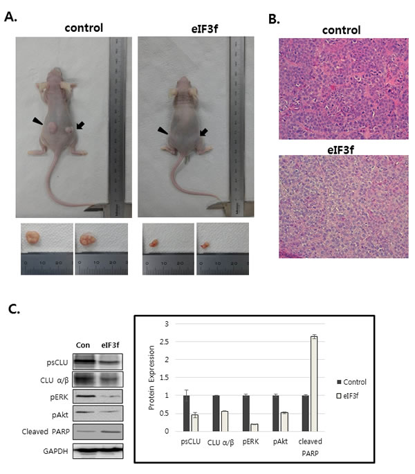 We next explored whether eIF3f inhibits tumor growth in vivo. Exponentially growing HeLa cervical cancer cells were transfected transiently with eIF3f expression or control vector, and the cells were injected subcutaneously into immune-deficient BALB/c nude mice. Animals (5-7 per group) were then monitored for tumor growth and morphology for 33 days. Figure 9A shows that the tumor mass in mice transfected with pCDNA3-eIF3f was diminished significantly compared with tumors in mice transfected with control vector. Collectively, these results suggest that eIF3f had obvious antitumor effects. Paraffin sections of tumor tissue were stained by H&E for histological analysis. The control showed high-grade carcinoma with an irregular cell distribution. In contrast, eIF3f treated tumor exhibited large areas of apoptotic cells (Figure 9B). We next investigated the inhibitory effect of eIF3f on CLU expression and Akt and ERK signaling pathway in tumor tissues harvested from control and eIF3f treated mice. eIF3f transfection was observed to significantly decrease the psCLU and α/β CLU expression and inhibit Akt and ERK phosphorylation. And the cleaved PARP, a apoptosis marker level was increased (Figure 9C). Collectively, these results clearly demonstrate that eIF3f can be a potent tumor suppressor in this animal model.