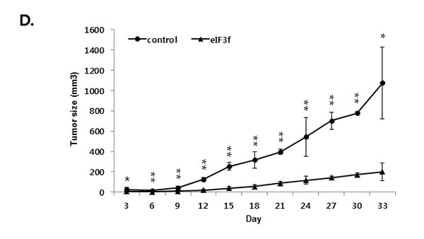 Figure 9: eIF3f inhibits tumor growth in vivo. Control or eIF3f-transfected HeLa cells (2.5 × 106 per mouse) were implanted into nude mice. A. The images show representative samples on day 33. The arrow indicates the injection sites. B. Paraffin sections of eIF3f treated and control tumors were stained with hematoxylin-eosin(H&E) C. Soluble protein extracts from xenograft mice were subjected to immunoblotting for the indicated proteins (CLU, pAkt, pERK, cleaved PARP). D. The growth curves show the calculated tumor sizes in mice of each group (n = 5 to 7 per group), and data are presented as means ± SD at each time point.