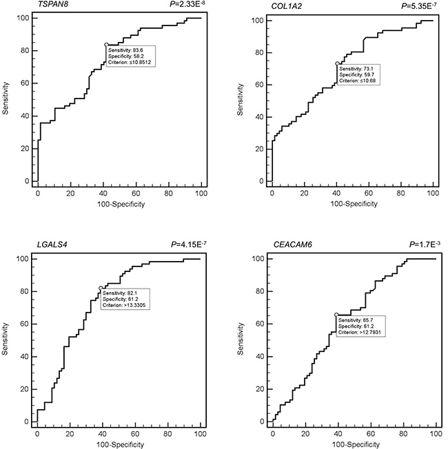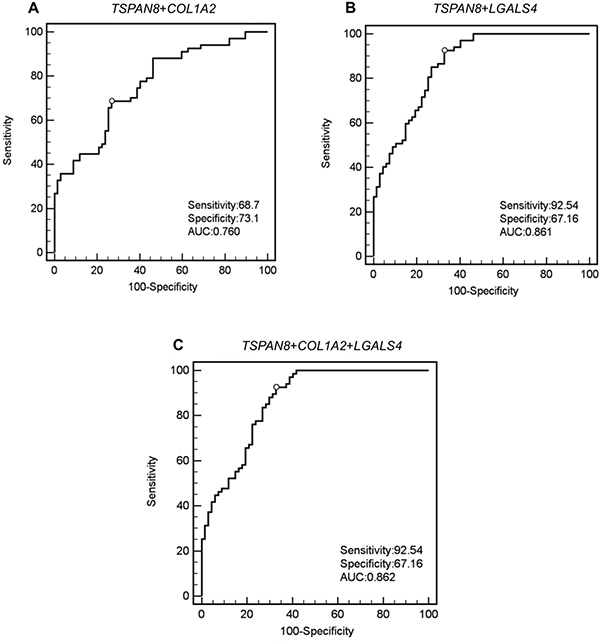 Interestingly, by combining TSPAN8 and LGALS4, which display specular expression in cancer and/or normal blood (TSPAN8 is higher in CRC blood, whereas LGALS4 is lower), we detected promising values of sensitivity and specificity compared to the markers alone. The TSPAN8 and COL1A2 combination displays an improvement in specificity increasing to 73.1%.