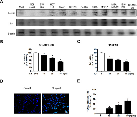Figure 1: Effect of IL-4 on cancer cell growth and apoptotic cell death. Expression of IL-4Rα in various cancer cell line including B16F10 melanoma cells (A). Concentration-dependent effect of IL-4 on the MTT viability assay in SK-MEL-28 and B16F10 after 24 hr (B and C). The B16F10 melanoma cells were treated with IL-4 for 24 hr, and then labeled with DAPI and TUNEL solution (D). Total number of cells in a given area was determined by using DAPI nuclear staining (fluorescent microscope). The green color in the fixed cells marks TUNEL-labeled cells. The apoptotic index was determined as the DAPI-stained TUNEL-positive cell number/total DAPI stained cell number (magnification, 200×) (E). Values were means ± S.D. of three experiments. *(P < 0.05) indicates statistically significant differences from the control cells.