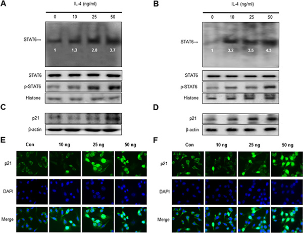 Figure 3: Effect of IL-4 on STAT6 activation and expression of p21. Nuclear extract from melanoma cells treated with IL-4 (10, 25, and 50 ng/ml) for 1 hr was incubated in binding interaction of 32P-end-labeled oligonucleotide containing the STAT6 sequence. The present EMSA results are representatives of three experiments. The cells treated with IL-4 for 1 hr was incubated and were lysed, nuclear proteins were used to determine the expression of STAT6, p-STAT6 and Histone (internal control) in SK-MEL-28 human melanoma cells and B16F10 murine melanoma cells (A and B). Western blot analysis with antibodies against p21 and β-actin (C and D). β-actin protein was used an internal control. Each band is representative for three experiments. Melanoma cells were treated with 10 to 50 ng/mL IL-4 for 24 h, and then the intracellular location of p21 was determined by immunofluorescence confocal scanning microscope (magnification, 630×). Double staining (Merge) with p21 and 4′, 6-diamidino-2-phenylindole (DAPI) staining shows the localization of p21 in the nucleus (E and F).