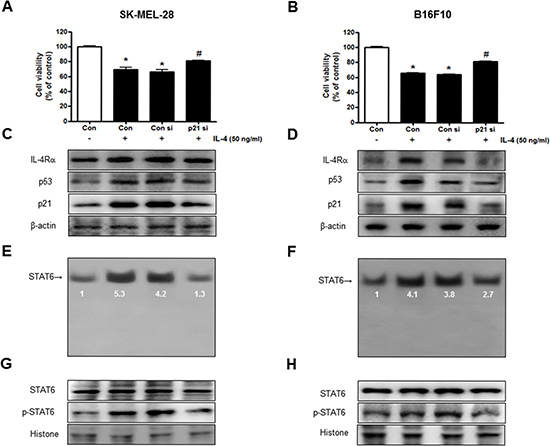 To determine the relationship between p21 expression and SK-MEL-28 and B16F10 melanoma cells growth and STAT6 activity in the inhibitory effects of IL-4, we transfected SK-MEL-28 and B16F10 melanoma cells with p21 siRNA using a transfection agent. The melanoma cells were transfected with 100 nM siRNA of p21 for 24 hr, and then treated with IL-4 (50 ng/ml) for 24 hr. Knock down of p21 almost completely reversed the cell growth inhibitory effect of IL-4 in SK-MEL-28 (Figure 4A) and B16F10 cells (Figure 4B). We also found that expression of IL-4, IL-4Rα, p53 and p21 was also reversed (Figure 4C, 4D). IL-4-increased activity of STAT6 by IL-4 was also abolished by transfection with p21 siRNA in SK-MEL-28 and B16F10 melanoma cells (Figure 4E, 4F). Increased nucleus phosphorylation of STAT6 by IL-4 was also abolished by transfection with p21 siRNA in SK-MEL-28 and B16F10 melanoma cells (Figure 4G, 4H).