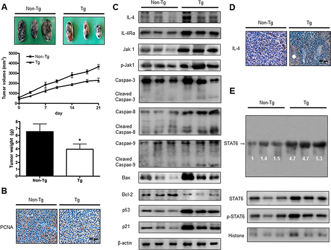 Figure 5: IL-4 inhibited tumor growth in melanoma model. Tumor growth inhibition (as assessed by tumor volume) in B16F10 bearing IL-4 mice. Tumor burden was measured twice per week using a caliper, and volume was calculated with volume length (mm) × width (mm) × height (mm)/2. Tumor weight and volume are presented as means ± S.D. (A). Immunohistochemistry was used to determine expression levels of PCNA in tissues of IL-4 mice and non-transgenic mice (B). The expression of IL-4 and apoptotic proteins was detected by western blotting using specific antibodies; IL-4, IL-4Rα, Jak1, p-Jak1, cleaved caspase-3, Bcl-2 and β-actin (C). β-actin protein was used an internal control. Tumor sections were analyzed by immunohistochemistry for detection of IL-4 expression in tumor tissues (D). STAT6 activity in tumor tissues was detected by EMSA and nuclear location of STAT6 was determined by western blotting. (E). All values represent mean ± SD from five animal tumor sections. *(P < 0.05) indicates significantly different from the control group.
