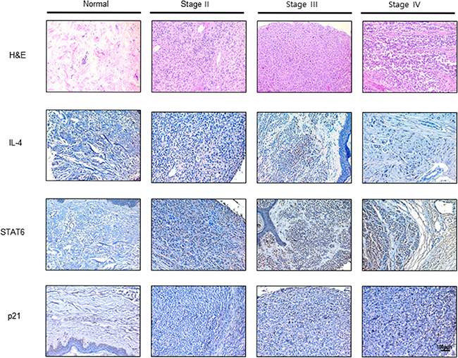 Figure 6: Expression of IL-4, STAT6 and p21 in human melanoma patients. Human normal skin or melanoma tissue sections (Stage II–IV) were processed and stained with H & E and immunohistochemistry analysis of the expression of IL-4, STAT6 and p21. The figures represented 3 samples of each cancer stage.