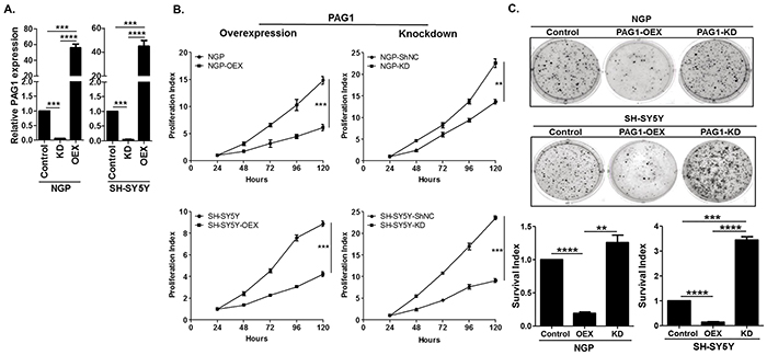 Figure 2: PAG1 is a tumor suppressor in neuroblastoma in vitro. A. Quantitative PCR (qPCR) analysis of PAG1 mRNA expression in PAG1 overexpression and knockdown cell lines in NGP and SH-SY5Y. Experiment was performed in triplicates and repeated thrice. Data represented as mean ± SD (T-test, ***p<0.001, ****p<0.0001). PAG1 mRNA expression in control cell lines NGP and SH-SY5Y was used to quantitate relative expression. B. Cellular proliferation assay of PAG1 gain and loss of function in NGP and SH-SY5Y NB cell lines. Cell proliferation was measured using MTS assay over 120 h. Proliferation index over the time was calculated by normalizing to the 24 h time point. Experiments were repeated three times with six replicates for each condition and represented as mean ± SD. (T-test, **p<0.01, ***p<0.001). C. Representative pictures of colony formation assay for PAG1 gain and loss of function in NB cell lines. Survival index shows the quantitation of relative inhibition of colony formation in different cell lines and is normalized to control or original cell line. Data represented as mean ± SD (T-test, **p<0.01, ***p<0.001, ****p<0.0001). OEX= PAG1-overexpression, KD= PAG1-knockdown, shNC= negative/mock control knockdown.