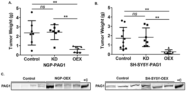 Figure 3: PAG1 is a tumor suppressor in neuroblastoma in vivo. A. Tumor xenografts of different PAG1 gain and loss of function cell lines in NGP and B. SH-SY5Y were developed and tumor weights were analyzed. Data represented for individual tumors in cohorts and as mean ± SD (Mann-Whitney test, ns= non significant, **p<0.01). C. Western immunobloting analysis of tumor samples shows overexpression of PAG1 in NGP-OEX and SH-SY5Y-OEX tumor xenografts in comparison to control NGP and SH-SY5Y xenografts respectively. Protein was isolated from flash frozen tumor tissues. +C represents positive control and is the protein isolated from respective OEX cell line. OEX= PAG1-overexpression, KD= PAG1-knockdown.