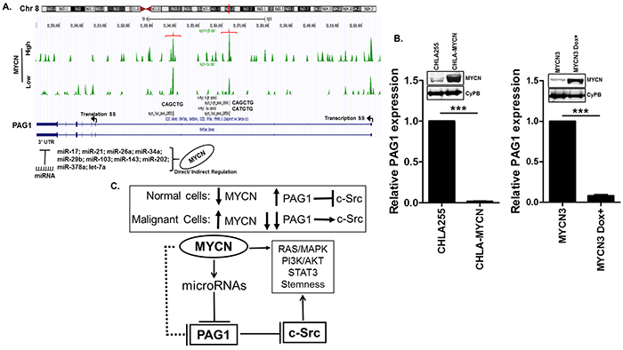 Figure 5: Transcriptional regulation of PAG1 in neuroblastoma. A. MYCN ChIP-seq database [16] analysis in MYCN high and low conditions at the PAG1 gene locus showing two binding sites with non-canonical e-boxes (brackets). Arrows represent the transcription and translation start sites on PAG1 gene. Analysis of PAG1 3′UTR shows binding sites of several miRNAs directly or indirectly activated by MYCN. B. Transcription profiling of PAG1 mRNA expression in two independent MYCN overexpression models in neuroblastoma. CHLA-MYCN cell line stably overexpress MYCN [17] and MYCN3 cell line express MYCN in response to doxycycline induction [16]. MYCN3 cell was either not treated or treated with doxycycline for 24 h. Western Immunoblot for MYCN was performed to validate the expression models and CyPB was used as loading control. PAG1 mRNA expression was analyzed by qPCR and represented as mean ± SD (T-test, ***p<0.001). Experiment was performed in triplicates and repeated thrice. PAG1 mRNA expression in control cell lines CHLA-255 and MYCN3 was used to quantitate relative expression. C. PAG1 repression contributes to neuroblastoma tumorigenesis. In normal non-malignant cells with normal PAG1 levels, c-Src activity is limited by PAG1/Csk induced negative phosphorylation. In malignant cells high levels of MYCN represses PAG1 that results in further c-Src activation. MYCN either directly or indirectly via miRNAs represses PAG1 expression. Inhibition of PAG1 leads to increased c-Src levels that further enhance activation of multiple oncogenic pathways including STAT3, PI3K and others.