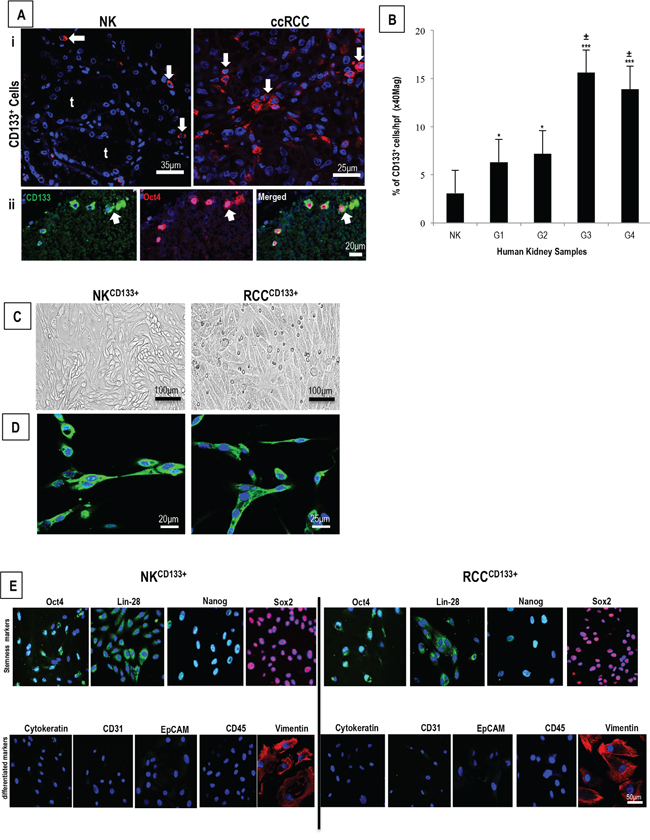 Immunostaining on sections of NK demonstrated rare interstitial CD133+cells (NKCD133+) (mean <3%) within the cortex, consistent with a previous report [10]. In comparison, sections of ccRCC contained a noticeably higher frequency of RCCCD133+cells (RCCCD133+), which increased further with tumor grade (Figure 1A panel i, quantified in B), ranging from mean ~6-8% in grade 1/2 tumors to 14-16% in grade 3/4 tumors. Combined-immunostaining for CD133 and a stem cell transcription factor, Oct4, demonstrated a strong nuclear staining of Oct4 in 8% of NKCD133+ and 12% of RCCCD133+cells (Figure 1A, panel ii). Cultures of CD133+cells isolated from either NK and ccRCC demonstrated spindle-shaped morphology and scanty cytoplasm (Figure 1C). Because the glycosylated form of CD133 expression that is recognized appears to vary with the antibody used for staining [39] and because different glycosylation patterns may be indicative with stemness, we tested different antibodies on our isolated cell populations. Four different anti-CD133 monoclonal antibodies (W6B3C1, AC133, ab19898, E93002) displayed concordant immunolabeling (Supplementary Figure 1) and the same cells expressed a marked signal for stem cell-associated markers [Oct4, Lin28, Nanog and Sox2) and for vimentin but lacked epithelial [cytokeratin and epithelial cell adhesion molecule (EpCAM)], endothelial [PECAM-1 (CD31)] and leukocyte [leukocyte common antigen (CD45)] markers (Figure 1E). This phenotype is most consistent with but does not absolutely establish identity as a stem cell population.