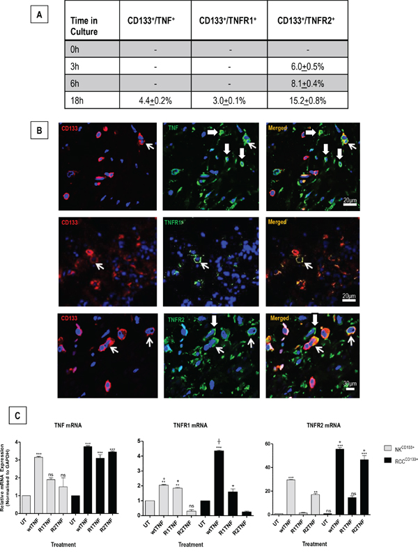Figure 2: A. CD133+ cells isolated from RCC (RCCCD133+) were quantified for expression of TNF or TNFR1 or TNFR2 at basal level (0h) and after treatment with wtTNF at various time points (3, 6 & 18h). TNFR2 expression is detected in cells at 3, 6 and 18h, with a higher level of expression after 18h. In comparison, expression for TNF and TNFR1 is only detected after 18h cultures. B. Representative images of corresponding ccRCC organ cultures show staining of TNF or TNFR1 or TNFR2 in CD133+cells (open arrows), with a few CD133-cells also positive for TNF or TNFR2 (shaded arrows). C. qRT-PCR analysis of RCCCD133+ and NKCD133+cells at day 7 following treatment with wtTNF, R1TNF and R2TNF show mRNA expression normalized to control samples value of 1 for each cell type. Error bars represent the mean ± SEM, ***p<0.0001 vs UT; **p<0.001 vs UT; +p<0.05 vs R2TNF; ┼p<0.05 vs R1TNF, ns-not significant analyzed by ANOVA and Bonferonni post hoc; of data from at least 3 independent experiments with similar results.