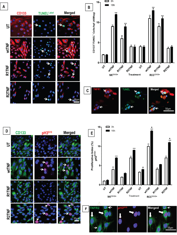 Figure 3: Representative confocal images of tissue-enriched CD133+cells from ccRCC and NK (RCCCD133+ and NKCD133+) immunostained for CD133 followed by TUNEL assay. A. Untreated (UT) and R2-TNF-treated cultures show a rare signal for TUNEL (arrows). In contrast, cultures treated with wtTNF and R1TNF show an increased number of TUNEL+nuclei (arrows). B. Quantification of RCCCD133+/TUNEL+ and NKCD133+/TUNEL+ in 10 random fields of view at x40 magnification show a time-dependent increase in the number of positive cells, more pronounced in 18h than 3h cultures, with C. some RCCCD133+/TUNEL+cells are also positive for TNFR1 (red) D. RCCCD133+cells immunostained for pH3S10 (marker of cell cycle) show a rare pH3S10 positive nuclei in untreated (UT) and in R1TNF-treated cultures, while wtTNF and R2TNF-treated cultures show a strong signal (arrows). E. Percentage of RCCCD133+/pH3S10+cells in 10 random fields of view at x40 magnification, presented as proliferative index, show a time-dependent increase in proliferative cells, more pronounced in 18h cultures. F. Some proliferative RCCCD133+/pH3S10+cells are also positive for TNFR2 (green) (shaded arrows) with a few non-poliferative cells (pH3S10-) positive for TNFR2 (open arrows). Nuclei stained with Hoechst-33342. Bars=mean + SEM, ***p<0.0001; **p<0.001 ; +p<0.05 signify statistically significant difference between treatments, data are from at least 3 independent experiments with similar results, ns-not significant.