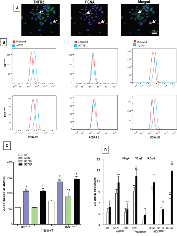 Figure 4: A. Representative confiocal images of combined staining for TNFR2 and proliferative nuclear antigen (PCNA) showing co-staining in some RCCCD133+ cells (arrows). B. Representative flow cytometry analysis of similar cultures from ccRCC and NK (RCCCD133+ and NKCD133+) show a high expression of PCNA induced by wtTNF- or R2TNF-treatment as compared to R1-TNF-treated and control cultures (UT) after day 4. Quantification of two cell viability assays; CCK-8 C. and trypan blue exclusion assay D. are concordant with flow cytometry showing an increase cell viability in cultures treated with wtTNF- and R2TNF as compared to UT and R1TNF-treated cultures. Error bars represent the mean + SEM, ***p<0.0001 vs UT; **p<0.001 vs UT, ¥p<0.05 vs R1TNF; ±p<0.05 vs Day 2 (R2TNF), ns-not significant; data of at least 3 independent experiments with similar results.