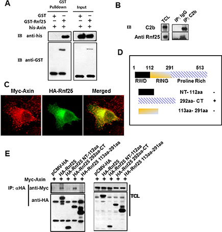 Figure 1: Rnf25 interacts with Axin. (A) Purified GST-Rnf25 fusion protein pull down the RGS domain of Axin with his-taq in vitro. Right panel shown the input control. (B) Rnf25 interacts with Axin endogenously. Rnf25 is detected by anti-Rnf25 antibody in the C2b IP system. (C) Axin co-localizes with the Rnf25 in HeLa cells. Myc-Axin and HA-Rnf25 were co-transfected and respectively visualized by anti-Myc (Red), and anti-HA (Green). (D) Schematic depiction of HA-tagged wild type and deletion mutants of Rnf25. (E) Axin interacts with the Proline-Rich domain but not the RING domain of Rnf25. HEK293T cells were transfected with the indicated plasmids. Lanes 2 and 5 of the left panel demonstrate that Axin was precipitated when the HA-Rnf25 or HA-Rnf25 292aa-CT was expressed. IP, ImmunoPrecipitation; WB, Western Blotting; TCL, Total Cell Lysates.