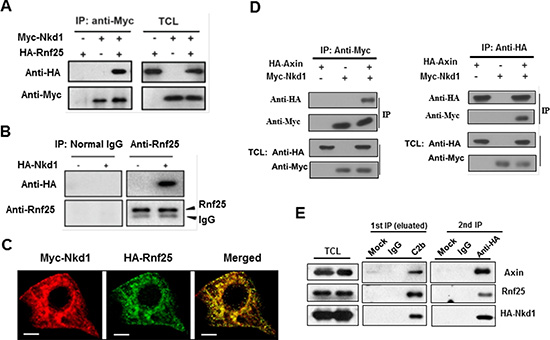 Figure 2: Rnf25 interacts with Nkd1-Axin complex. (A) HA-tagged Rnf25 was expressed alone or together with Myc-tagged Nkd1 by transient transfection into HEK293T cells. Total cell lysates were immunoprecipitated with anti-Myc antibody. Protein complexes were subjected to western blotting with either anti-HA or anti-Myc antibody (left panel). Rnf25 and Nkd1 protein in total cell lysates were detected by western blot (right panel). (B) Endogenous Rnf25 interacts with over-expressed Nkd1. HA-tagged Nkd1 was transfected into HEK293T cells. Rnf25 was then immunoprecipitated from cell lysates using anti-Rnf25 antibody. The precipitates were detected for Nkd1 using anti-HA and for Rnf25 using anti-Rnf25 by western blotting. (C) Rnf25 co-localizes with the Nkd1 in HeLa cells. Myc-Nkd1 and HA-Rnf25 were co-transfected into HeLa cells. Cells were fixed and immuno-stained. Nkd1 was visualized by anti-Myc (Red), and Rnf25 by anti-HA (Green). (D) Nkd1 interacts with Axin. 24 h after co-transfected with HA-Axin and Myc-Nkd1 expressing plasmids, HEK293T cells were lysed and subjected to reciprocal immunoprecipitation using either anti-Myc or anti-HA antibody. Precipitations and total cell lysates were analyzed by western blotting with indicated antibodies. (E) Rnf25 forms ternary complex with Axin and Nkd1. 24 h post-transfected with HA-Nkd1 expressing plasmid, HEK293T cells were collected and cell lysates were subjected to two-step co-IP by firstly incubating with control IgG or C2b antibody that against to Axin. The eluate from the first immunoprecipitate was then immunoprecipitated with control IgG or anti-HA antibody followed by Western blotting using indicated antibodies.