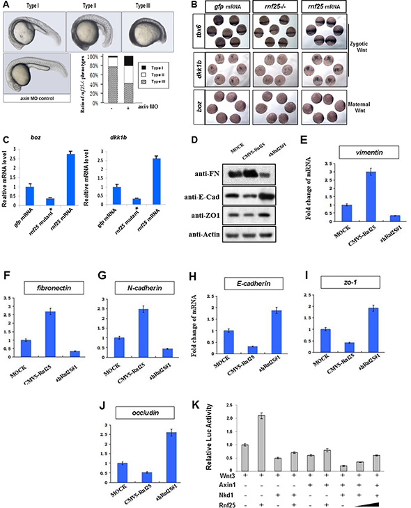 Figure 3: Rnf25 regulates zebrafish embryonic development and canonical Wnt signaling. (A) Knockdown of axin1 partially rescued the rnf25 mutants in developing zebrafish morphology represented by the decreased ratio of Type III (the most severely impaired) rnf25 mutants and the increased ratio of Type I (mildly impaired) rnf25 mutants. The dose of axin morpholino injection or control morpholino was stabilized on 2 ng each embryo. (B) rnf25 mutation (middle) or overexpression (right) injection affected zygotic and maternal Wnt signaling, represented by the in situ hybridization of zygotic Wnt targets tbx6 and dkk1b, and maternal Wnt target boz/dhama. Embryos injected with the same amount of gfp mRNA (left) were served as loading-control. (C) The transcription of boz/dhama (left panel) and dkk1b (right panel) in zebrafish embryos were impaired by rnf25 mutant and enhanced by rnf25 mRNA injection. gfp mRNA injections were served as control. (D) Detecting the protein levels of E-Cadherin, Fibronectin and ZO-1 in MOCK, Rnf25 over-expression and Rnf25 knocking-down mK3 cells. (E–G) Fold change of transcripts of mesenchymal markers including vimentin, n-cadherin and fibronectin in mK3 cell system. (H–J) Fold change of transcript of epithelial markers including zo-1, e-cadherin and occludin in mK3 cell system. (K) Rnf25 over-expression restrained the inhibitory effect of Nkd1 and Axin on Wnt signaling in a dose dependent manner. HEK293T cells were transfected with indicated plasmids and treated with Wnt3 to initiate Wnt signaling. Axin and Nkd1 co-transfection significantly inhibited Lef1-Luc activity (lane7). The addition of Rnf25 decreased Lef1-Luc activity in a dose dependent manner (lane8, 9). Data obtained from triplicates are presented as the mean SD of a representative experiment. FN, Fibronectin; E-Cad, E-Cadherin.