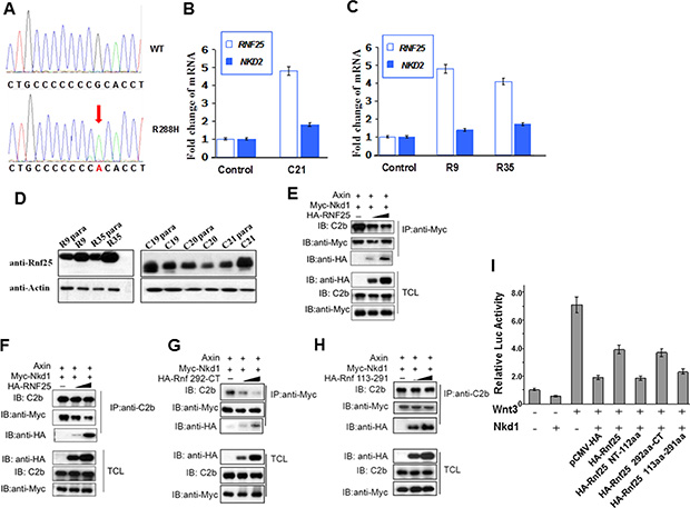 Figure 4: Rnf25 and Nkd1 maintain the balance of Wnt signaling in vivo. (A) Sequencing results on human Rnf25 gene in tumor and para-carcinoma tissues. The red arrow indicated the same point mutation in three different tissues. (B) The relative transcriptional levels of rnf25 and nkd2 in carcinomatous and paracarcinomatous tissues from different colorectal tumors. (C) The relative transcriptional levels of rnf25 and nkd2 in carcinomatous and paracarcinomatous tissues from different renal tumors. (D) The protein level of Rnf25 in carcinomatous and paracarcinomatous tissues. R9 and R35 indicated Renal tumors, C19-C21 indicated Colorectal tumors. (E–H) HEK293T cells were transfected with Axin and Myc-Nkd1 together with 0.1-1ug HA-Rnf25 (E and F) or HA-Rnf25 292-CT (G) or HA-Rnf25 113–291 (H). Total cell lysates were immunoprecipitated with anti-Myc (E and G) or C2b (F and H) antibodies. Immunoprecipitates were detected by C2b, anti-HA and anti-Myc (upper panels) antibodies. (E) and (F) show that Rnf25 diluted Nkd1-Axin interaction. This inhibitory effect depends on the 292aa-CT Proline rich region of Rnf25 as was shown in (G), but not the 113aa-291aa RING domain of Rnf25 (H). Total cell lysates were western blotted using indicated antibodies and served as input control (lower panels). (I) Functional TOP-FLASH study on the functions of the Core-Peptides to the inhibitory role of Nkd1. Wnt3 group worked as the positive control, while the group with Wnt3-Nkd1 worked as the negative control. HA-tagged wild type and deletion mutants of Rnf25 were co-transfected as labeled in the figure.
