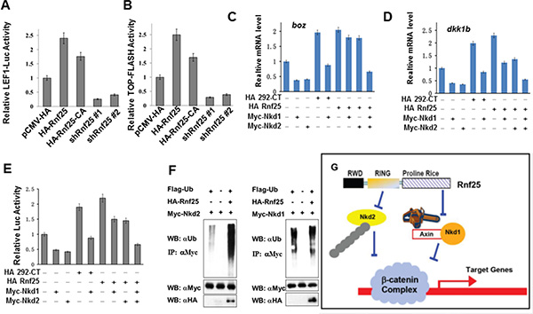 Axin has emerged as a fundamental scaffold protein in multiple cell signaling pathways, including Wnt/Beta-Catenin signaling that binds to varied components in the pathway, and thus integrates inducing signals to downstream responders [13]. Distinct Axin affinity shown by Nkd1 and Nkd2 raised the intriguing possibility of the existence of novel factors engaged in the Nkd family-associated regulation of Wnt signaling. Rnf 25/AO7 is a previously established RING finger-dependent E3 ubiquitin ligase, participating in NF-kappaB [14] and EGF Receptor (EGFR) signaling [15]; and Nkd2 is one of the Rnf25 E3 targets. Here we report the identification of Rnf25 as a novel Axin-interacting protein that forms a ternary complex with Axin-Nkd1 and promotes Wnt signaling via two separate but cooperative mechanisms, which also suggests diverse roles of Nkd1 and Nkd2 in Wnt signaling.