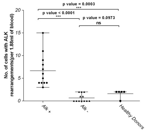 The number of ALK-positive rearranged CTCs retrieved from ALK-positive patients was significantly enriched compared with ALK-negative patients (p < 0.0001) and healthy donors (p = 0.0003) (Figure 3).