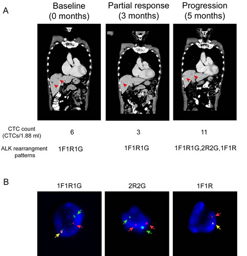 Figure 4: An index case suggests that ALK-rearranged CTCs could have clinical application as a diagnostic biomarker to monitor crizotinib treatment and response. A. CT scan taken at baseline, partial response and progression time points showing presence of metastatic tumor in liver (arrow). CTC counts and ALK rearrangement patterns for each time point is indicated in the lower panel. B. Representative images showing 1F1R1G, 2R2G and 1F1R ALK rearrangement patterns following progression on crizotinib treatment. Yellow, red and green arrows represent fusion (F), orange (R) and green (G) fluorescent signals.