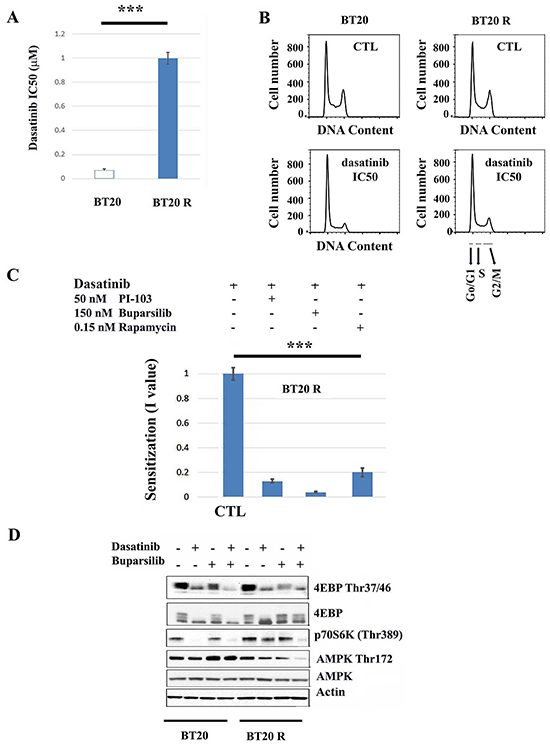 Figure 1: Inhibitors of the PI3K/mTORC11 pathway enhance the antiproliferative effect of dasatinib in resistant BT20 cells. A. Exponentially growing parental (BT20) and resistant (BT20R) cells were exposed to dasatinib (0-5 μM) for 5 days and the IC50 concentrations (indicated in the y-axis) obtained using the SRB assay. The bars represent the mean value of 5 independent experiments plus minus the standard error. The asterisks (***) indicate a p<0.001 (paired t-test). B. Exponentially growing parental (BT20) and resistant (BT20R) cells were treated with vehicle or the respective dasatinib IC50 concentration (0.04 and 1 μM respectively) for twenty four hours and changes in cell cycle progression as described. The y-axis indicates cell number and the x-axis DNA content. As indicated by the arrows differences in DNA content correspond to the different cell cycle phases: Go/G1 (2N), S (>2N), G2/M (4N). Representative results of 3 experiments. C. The graph bars represents the mean I values (n=4) plus/minus the standard error, obtained as described in materials and methods using the SRB assay 5 days after treatment. BT20R cells were treated with dasatinib (0-5 μM) in combination with vehicle (CTL), PI3-103 (50nM), Buparsilib (150 nM) or Rapamycin (0.15 nM). Statistical analysis indicates that the sensitization I values obtained by the combination of dasatinib with the indicated inhibitors are lower than the values obtained by the combination of dasatinib with vehicle. The asterisks (***) indicate a p<0.001 (One way ANOVA), followed by t-test with p<0.05. D. The effect of dasatinib (respective IC50 concentrations) alone or in combination with 150 nM Buparsilib on the phosphorylation state of mTORC1 downstream targets (4E-BP1 and p70S6K) or AMPK was assessed by western blot analysis. BT20 or BT20R cells were treated for forty-eight hours as indicated and phosphorylation of the indicated targets was assessed in 50μg of proteins extracts. Equal loading was confirmed by re probing with an α-actin antibody.