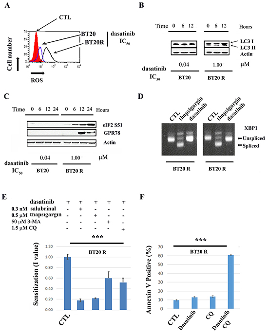 Figure 2: Drug-induced ER-stress and autophagy contribute to acquired resistance to dasatinib. A. Changes in the redox state of parental (BT20 blue line) or resistant (BT20R black line) cells after twelve hours after dasatinib treatment with the (respective IC50) is shown with respect to vehicle treated cells (in red). A representative experiment of three is shown. B. Conversion of LC3-1 to LC3-2 in parental BT20 or resistant BT20R cells was assessed by western blot analysis 0 to 6 hours after treatment with dasatinib IC50. Equal protein loading (50μg) was confirmed by re probing with an α-actin antibody. C. Changes in GPR78 expression levels and eIF2 phosphorylation in parental BT20 or resistant BT20R cells was assessed by western blot analysis 0 to 6 hours after treatment with dasatinib (respective IC50). Equal protein loading (50μg) was confirmed by re probing with an α-actin antibody. D. XBP-1 splicing was assessed in BT20 and BT20R cells twelve hours after treatment with vehicle (CTL), thapsigargin (THAP, 500 nM positive control) or dasatinib treatment (DAS, IC50 concentration). The arrows indicate XBP-1 splice variants. E. BT20R cells were treated with dasatinib (0-50μM) in combination with vehicle, non-toxic concentrations of drugs affecting the ER stress response (i.e. the inhibitor salubrinal or the inducer thapsigargin) or inhibitors of early (3-MA) or later (CQ) autophagy as indicated. Five days after treatment dasatinib IC50s in the combinations were obtained utilizing the SRB assay and used to calculate the sensitization values (I value) for each combination. The y-axis represent the mean I values (n=5) plus minus the standard error. The *** indicate a significant difference between the I values with respect to 1 (i.e. dasatinib in combination with vehicle) using ANOVA with p<0.001 followed by t-test. F. BT20 R cells were treated with vehicle (CTL), CQ (1.5 μM), dasatinib IC50 (1μM) or the combination of CQ and dasatinib for seventy two hours. Annexin V expression was assessed by flow cytometry as described in materials and methods. Increase in cell death by the combination of dasatinib plus CQ respect to the drugs alone was assessed by one way ANOVA (***p<0.001). The bars graph represent the mean values of Annexin V positive cells plus minus the standard error (n=4).