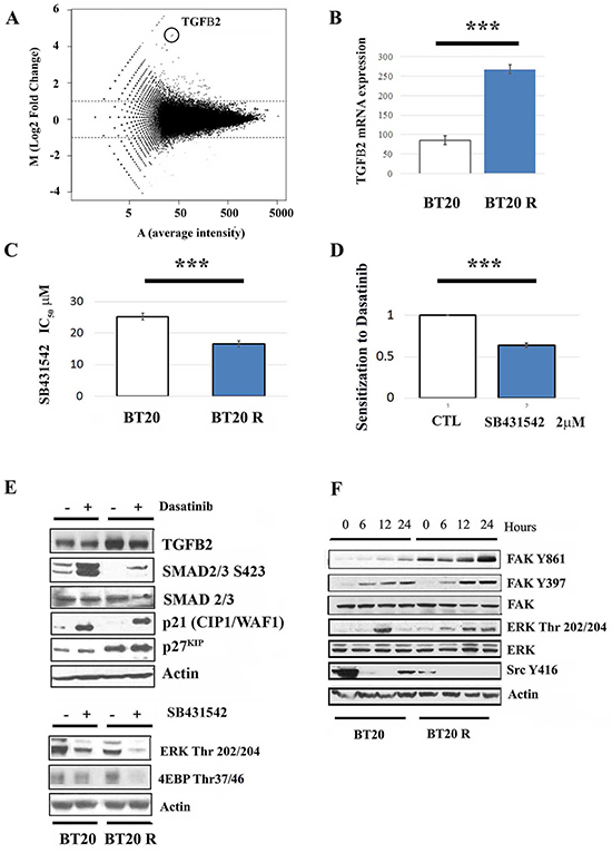 Figure 3: signaling contributes to acquired resistance to dasatinib. A. Volcano analysis showing differential gene expression in BT20 cells with acquired resistant to dasatinib (upper panel). B. Overexpression of 2 was confirmed by RT-PCR as described in materials and methods. *** indicates that BT20R cells express significantly higher levels of mRNA coding for TGFβ2 respect to parental BT20 cells with p<0.001 obtained after paired t-test analysis. The bars represent the mean value of 3 independent experiments plus/minus de standard error. C. Sensitivity to TGFβR inhibition was assessed using the SRB assay. The bar graph represents the mean SB43542 IC50 value (n=3) in parental (BT20) and resistant cells (BT20R) plus minus the standard error (upper panel). The asterisks (***) indicate a p<0.001 (t-test). D. BT20R cells were treated with dasatinib (0-50μM) in combination with vehicle or a non-toxic concentrations of SB43542 (2μM). Five days after treatment dasatinib IC50s in the combinations were obtained utilizing the SRB assay and used to calculate the sensitization values (I value). The y-axis represent the mean I values (n=3) plus/minus the standard error. The *** indicate a significant differences in I values with respect to the CTL (i.e. dasatinib + vehicle) using paired t-test with p<0.001. E. Changes in 2, p21WAF, p27KIP expression levels and phosphorylation status of SMAD2/3 was assessed by western blot assay twelve hours after treatment with vehicle or the IC50 concentration of dasatinib (upper panel). Treatment with the respective SB43542 IC50 concentration for 12 hours resulted in decreased ERK and 4E-BP1 phosphorylation (lower panel). Equal protein loading (50μg) was assessed by re probing with an α-actin antibody. Representative experiment of three. F. The effect of dasatinib on FAK, ERK and Src phosphorylation status was assessed by western blot analysis, 0 to 24 hours after treatment with dasatinib IC50 concentration. Equal protein loading (50μg) was assessed by re probing with an α-actin antibody. Representative experiment of three.