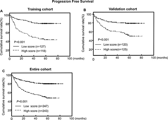 A total of 245 and 245 patients from the training and the validation cohorts were included for analyses. Median follow-up for PFS in the training cohort and the validation cohort were 55.6 months and 55.0 months, respectively. Five-year events rates for PFS in the training and validation cohorts were 67.3% and 70.2%, respectively. Details of patient characteristics are shown in Table 1.