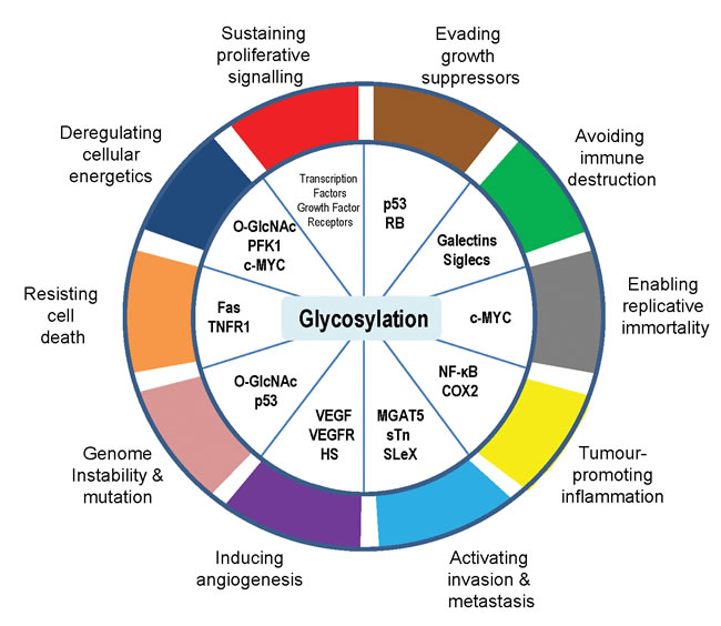 Growing evidence supports crucial roles for glycosylation during all steps of tumour progression, and it is well established that glycans regulate tumour proliferation, invasion, metastasis and angiogenesis [10, 11]. Aberrant glycosylation is frequently cited as a hallmark of cancer [11-15], but is notably absent from both the original hallmarks paper [1] and from the next generation hallmarks [3]. The goal of this review is to highlight glycosylation as a mechanistic concept integral to the recognised hallmark traits. Unique to our discussion is our focus on how glycosylation enables acquisition of all the 10 currently accepted hallmarks of cancer cells.