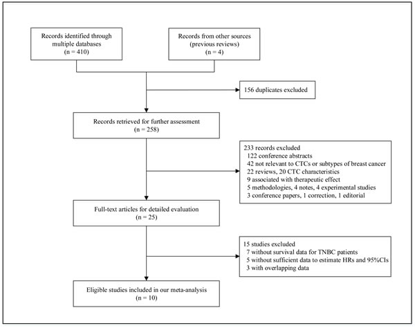 Figure 1 provides an overview of the process used to select the studies. A total of 414 records were initially identified by the comprehensive literature search, comprising 410 records from databases screening and 4 records from previous reviews. After reviewing the titles and abstracts, 156 duplicates were filtered out, and 233 records were subsequently excluded because they were conference abstracts, irrelevant to CTCs or subtypes of breast cancer, review articles, or experimental studies. This left 25 full-text articles for further assessment, of which 15 studies were excluded for not including survival data for TNBC patients [20-26], not providing sufficient information to extrapolate hazard ratios (HRs) and 95% confidence intervals (95% CIs) [27-31], or including patients who overlapped with those in other trials [8, 9, 32]. Finally, 10 eligible studies accounting for 642 TNBC patients were included for our meta-analysis [7, 10-18].