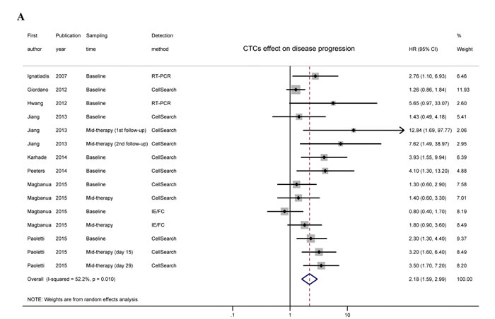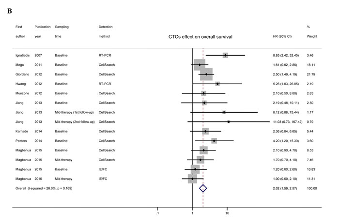 Two of the authors independently collected the following data from each eligible study: first author’s name, publication year, country, number of subjects analyzed, cancer stage, median follow-up, timing of blood collection, detection method, detection rate, and cut-off value for CTC status. We also recorded the prognostic outcomes (DFS, PFS, MFS, TTP, OS, survival curves, HR, and 95% CI, if available), regardless of whether they were tested by multivariate analysis. For one study [12], the reported HR indicated the CTC-negative rather than the CTC-positive arm. Thus we recalculated this HR by taking its reciprocal to maintain consistency with the other studies. When more than one blood sample per subject was collected at different time points, each sampling time point was documented and categorized as “baseline” or “mid- or post-therapy”. When more than one method was applied to detect CTCs, all results were considered as independent data sets. Any discrepancy was resolved by discussion or consultation.