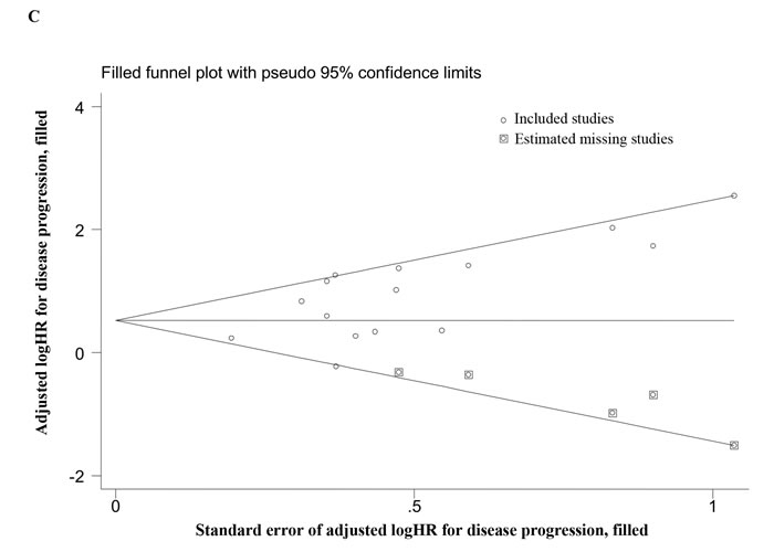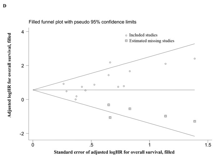 Figure 2: Overall analyses and imputed funnel plots. Forest plots of the HRs for disease progression A. and overall survival B. in TNBC patients. Imputed funnel plots by trim-and-fill analysis for disease progression C. and overall survival D. in TNBC patients.
