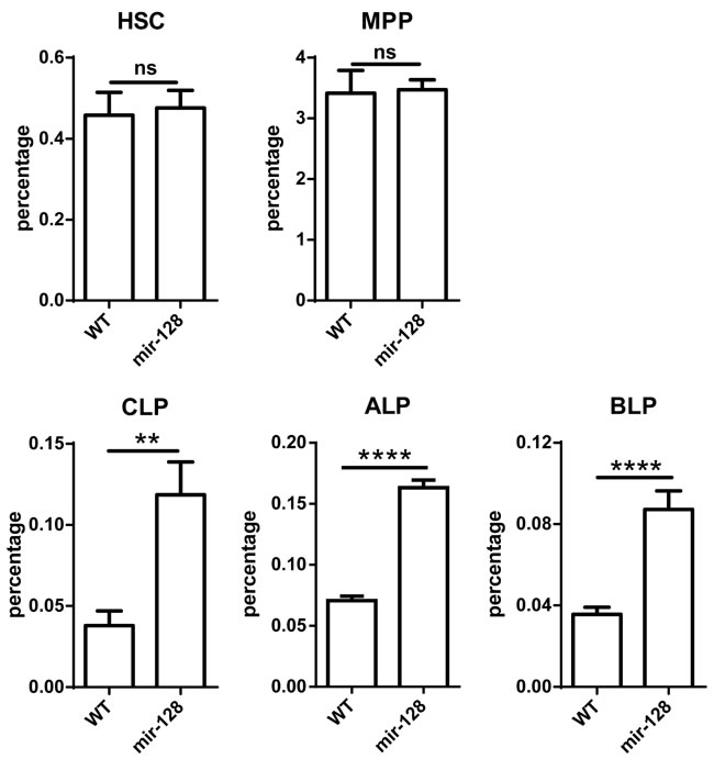 Figure 4: MiR-128-2 did not alter the percentages of HSC and MPP, but increased the percentages of CLP, ALP, and BLP compared with those in WT mice. BM from 6-8 week-old WT or miR-128-2 TG mice were prepared and stained with relative antibodies (as described in M&M) followed by FACS analysis. The data represent five repeats. ns: no significant difference, **P < 0.01, ****P < 0.0001.