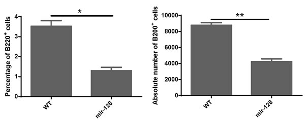 Figure 5: MiR-128-2-overexpressed CLP developed less B cells in the in vitro B cell culture system. CLP cells were sorted from WT or miR-128-2 TG mice and cultured as described in M&M. The cultured cells were harvested and stained with B220 fluorescence antibody and analyzed with FACS. The absolute number of B220+ cells were calculated (total harvested cells×percentage of B220+ cells). The data represent three repeats. *P < 0.05, **P < 0.01.