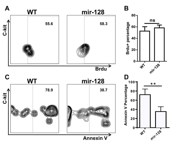 Figure 6: Annexin V staining and BrdU incorporation assay revealed that overexpressing miR-128-2 inhibited the apoptosis of CLP, but did not affect the proliferation of CLP. BM cells were stained with relative antibodies for CLP as described in M&M, and gated Lin-c-kitintSca1+ cells as CLP for Brdu A., B. or Annexin V C., D. analysis. The data represent three repeats. ns: no significant difference, **P < 0.01.