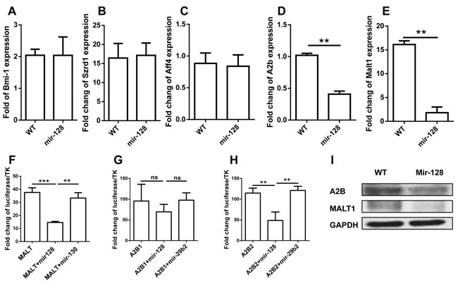 Figure 7: Identification of target genes of miR-128-2. Real-time PCR assay was adopted to evaluate the expression of Bmi-1, Szrd1, Aff4, A2b, and Malt1 A.- E.; Luciferase assays were conducted to measure the inhibition of miR-128-2 on the expression of MALT1 F. and A2B G. and H.. Protein expression levels of A2B and MALT1 were detected by Western blot I., with GAPDH as loading reference. The data represent three repeats. **P < 0.01, ***P < 0.001, ns: no significant difference.
