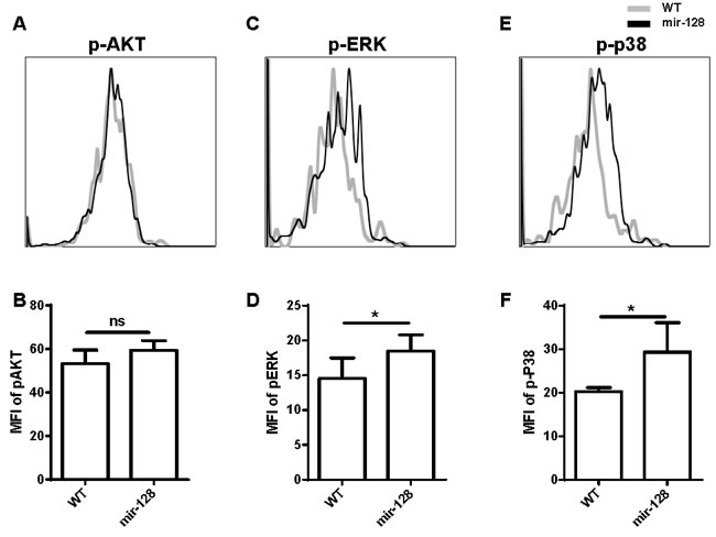 Figure 8: Phosphorylation of ERK and p38 MAPK was enhanced in miR-128-2-overexpressed CLP compared with those in WT CLP. The intracellular staining were conducted followed by FACS analysis showed as overlap histogram, the mean fluorescence intensity (MFI) were analyzed by FlowJo software. The data represent three repeats. ns: no significant difference, *P < 0.05.