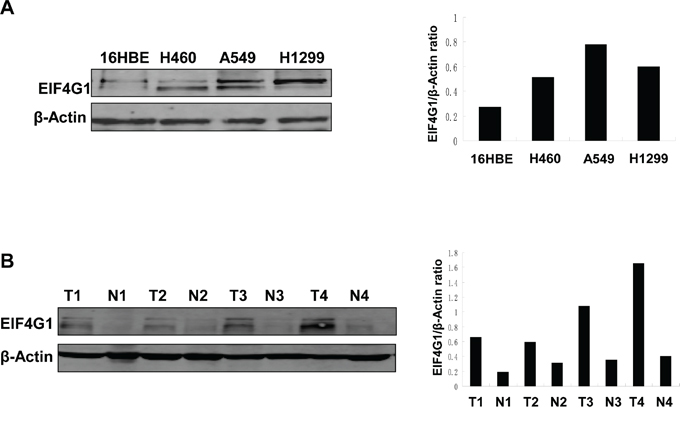 Figure 1: The increased levels of EIF4G1 expression in NSCLC cell lines and tumor tissues. A. EIF4G1 expression in 3 NSCLC cell lines (H460, A549, H1299) and normal lung epithelial cell line (16HBE) was detected and compared by immunoblots. B. Representative immunoblot results for EIF4G1 expression in tumor tissues (T) and adjacent normal tissues (N) collected from 4 NSCLC patients were shown. The protein band density was quantitated using Image-J software.