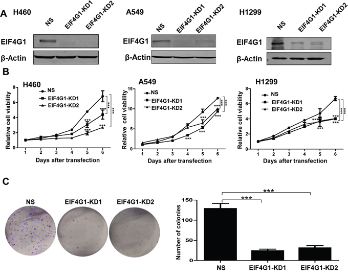Figure 2: EIF4G1 is required for NSCLC cell proliferation and anchorage-independent growth. A. The expression of EIF4G1 in stably “knock-down” NSCLC cells by using lentiviral vector containing 2 shRNA specifically targeting EIF4G1 (EIF4G1-KD1 and KD2) was detected by immunoblots. A non-silencing (NS)-shRNA was used as a negative control. B. The cell growth of stably EIF4G1 “knock-down” NSCLC cells and control (NS) was measured and compared by using the CCK8 assays. C. The anchorage-independent growth abilities of stably EIF4G1 “knock-down” A549 cells and control (NS) were measured by using colony formation assays. Error bars represent the S.E.M. for 3 independent experiments. ***=p<0.001.