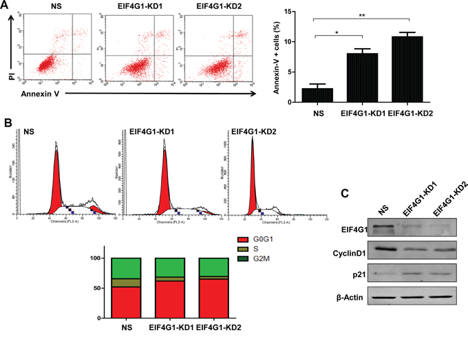 Figure 3: Targeting EIF4G1 induces NSCLC cell apoptosis and G0/G1 cell cycle arrest. A. Cell apoptosis of stably EIF4G1 “knock-down” A549 cells (EIF4G1-KD1 and KD2) and control (NS) was determined by Annexin-V/PI staining and flow cytometry analysis. Error bars represent the S.E.M. for 3 independent experiments. *=p<0.05, **=p<0.01. B-C. Cell cycle was determined by PI staining and flow cytometry analysis. Protein expression was detected by immunoblots.