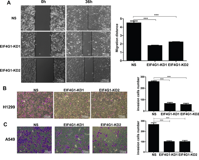 Figure 4: Targeting EIF4G1 blocks NSCLC cell migration and invasion. A. Cell migration of stably EIF4G1 “knock-down” H1299 cells (EIF4G1-KD1 and KD2) and control (NS) were examined using wound healing assays. B-C. Cell invasion of stably EIF4G1 “knock-down” H1299 and A549 cells and control (NS) were measured using transwell assays. Bars, 500μm. Error bars represent the S.E.M. for 3 independent experiments. ***=p<0.001.
