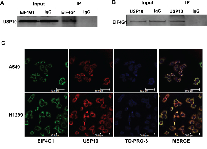 Figure 5: The interaction of EIF4G1 and USP10 in NSCLC. A-B. Immunoprecipitation assays were performed using anti-EIF4G1 and anti-USP10 antibodies (IgG is a negative control) as described in the Methods. C. The co-localization of EIF4G1 and USP10 in A549 or H1299 cells was confirmed using immunofluorescence assays. Bars, 50μm.