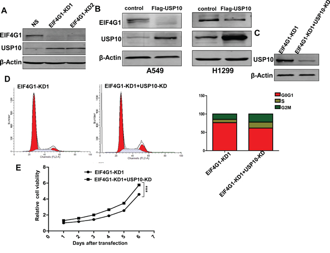 Figure 6: USP10 is involved in EIF4G1-mediated functions as a potential negative regulator. A. The expression of USP10 in stably EIF4G1 “knock-down” A549 cells (EIF4G1-KD1 and KD2) and control (NS) was determined by immunoblots. B. A549 and H1299 cells were transfected with for the recombinant USP10 vector (Flag-USP10) or control vector for 48 h, then protein expression was measured by immunoblots. C-E. A549 cells were stably transfected with shRNA-EIF4G1 (EIF4G1-KD1) together with or without shRNA-USP10 (USP10-KD), then protein expression, cell cycle and growth were analyzed as described previously. Error bars represent the S.E.M. for 3 independent experiments. ***=p<0.001.