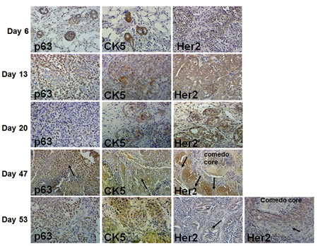 Figure 1: Immunohistochemical analysis of p63, CK5 and Her2/neu in MCF10DCIS.com xenografts. In day 47 xenografts, arrows indicate p63 and CK5 staining in infiltrating tumor cells, and decreased Her2/neu expression in cells near the basal surface. Her2/neu expression is reduced in microinvasive (long arrow) and luminal (short arrow) areas of advanced comedo-DCIS xenografts at day 53. The data are representative of at least five independent tumors. Magnification X10 (day 47); X20 (days 6 and 20), and X40 (days 13 and 53).