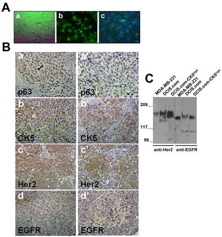 Figure 2: Her2/neu is overexpressed in MCF10DCIS.com subpopulations selected for CK5 overexpression. A. MCF10DCIS.com cells expressing CK5 promoter directed ZsGreen reporter expression. A, phase contrast micrograph; b and c, MCF10DCIS.com-CK5high cells isolated by FACS; c, DAPI stained MCF10DCIS.com-CK5high cells. Magnification X20. B. Comparison of p63, CK5, Her2/neu and EGFR staining in day 20 xenografts derived from MCF10DCIS.com-CK5high (a-d) and unselected parental MCF10DCIS.com (a’-d’) cells. Data are representative of five independent tumors. C. Western blot analysis of Her2/neu and EGFR in MDA-MB-231, MCF10DCIS.com and MCF10DCIS.com-CK5high whole cell lysates.