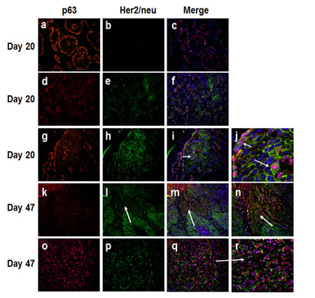 Figure 3: Immunofluorescence analysis of p63 and Her2/neu in MCF10DCIS.com xenografts. Note the presence of in situ carcinomas with p63 expression restricted to the myoepithelium and lacking Her2/neu (a-c), and those with p63 and Her2/neu expressions (d-f and g-j). Short arrow in panel j shows p63 and Her2/neu coexpression in the myoepithelial cells. The long arrow in panel j and the arrow in panel i show p63 and Her2/neu expression in the luminal region of DCIS. Panel j is a higher magnification of panel i. Panels k-n, expansion of infiltrating p63 positive cancer cells with decreased Her2/neu expression (arrows in l-n). Panel n is higher magnification of panel m. Panels o-r, infiltrating cancer cells coexpressing p63 and Her2/neu. Panel r is a magnified image of panel q (arrow). The results are representative of three independent experiments. Magnifications X20, panels d-f, k-m; X40, a-c, g-i, o-q; X100, n; X200, j and r.